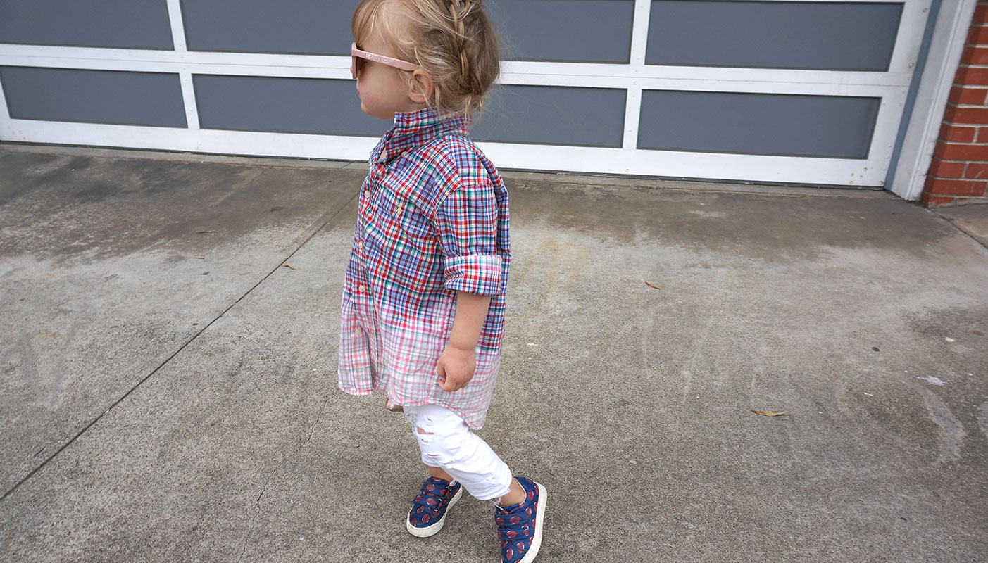 Today we've taken a boys red/white/blue plaid shirt and gave it a little customization. When you bleach navy it turns pink so this combo makes a perfect candidate for a 'dip-dyed' bleach treatment.